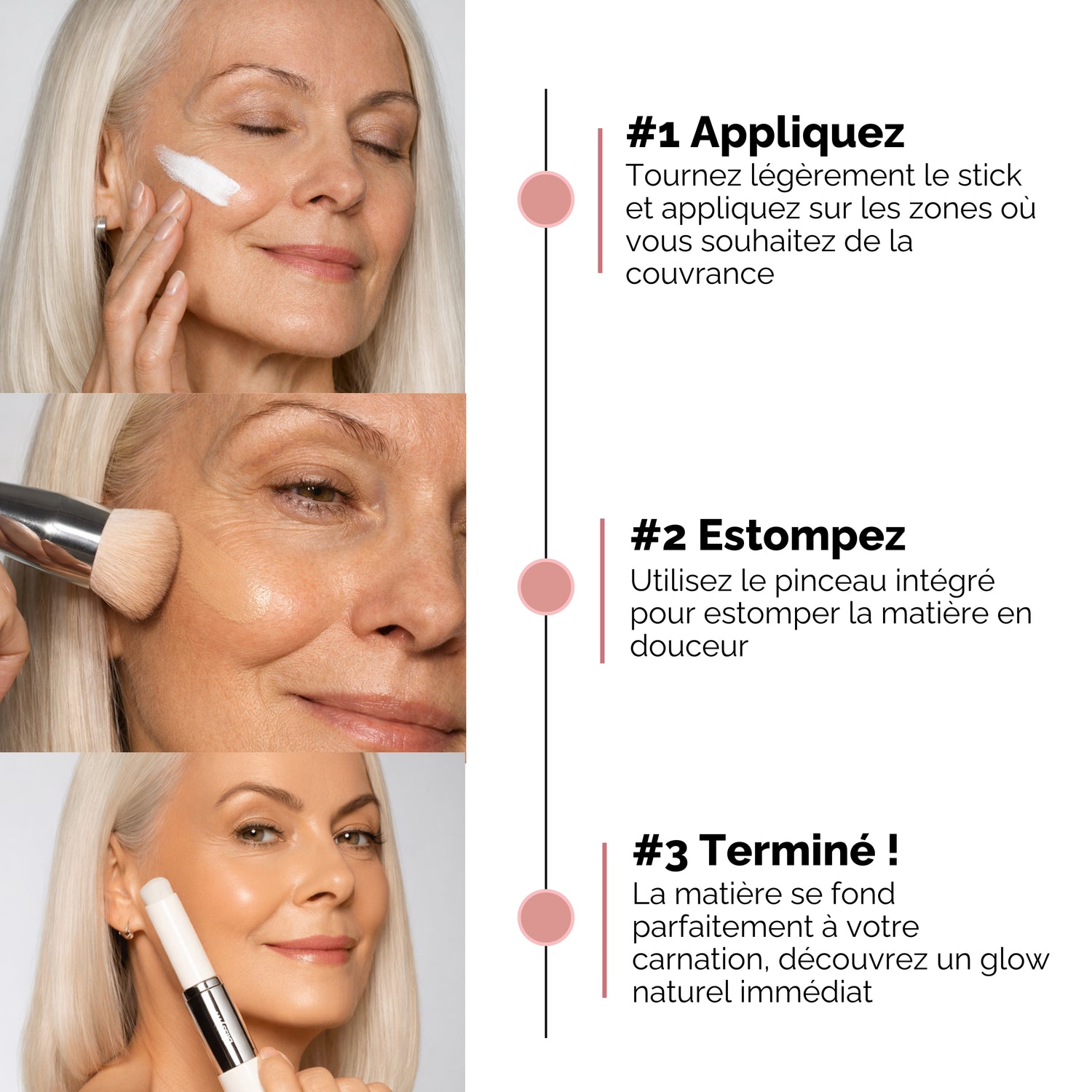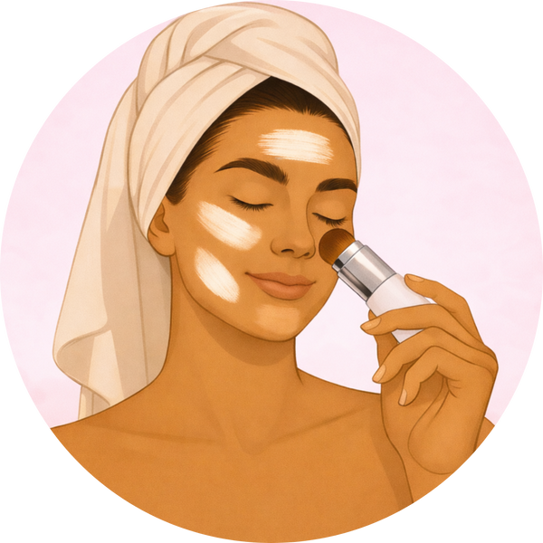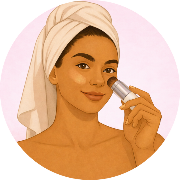 Appliquez le stick sur les zones clés, puis utilisez le pinceau intégré pour estomper la matière en petits mouvements circulaires, du centre du visage vers l’extérieur.