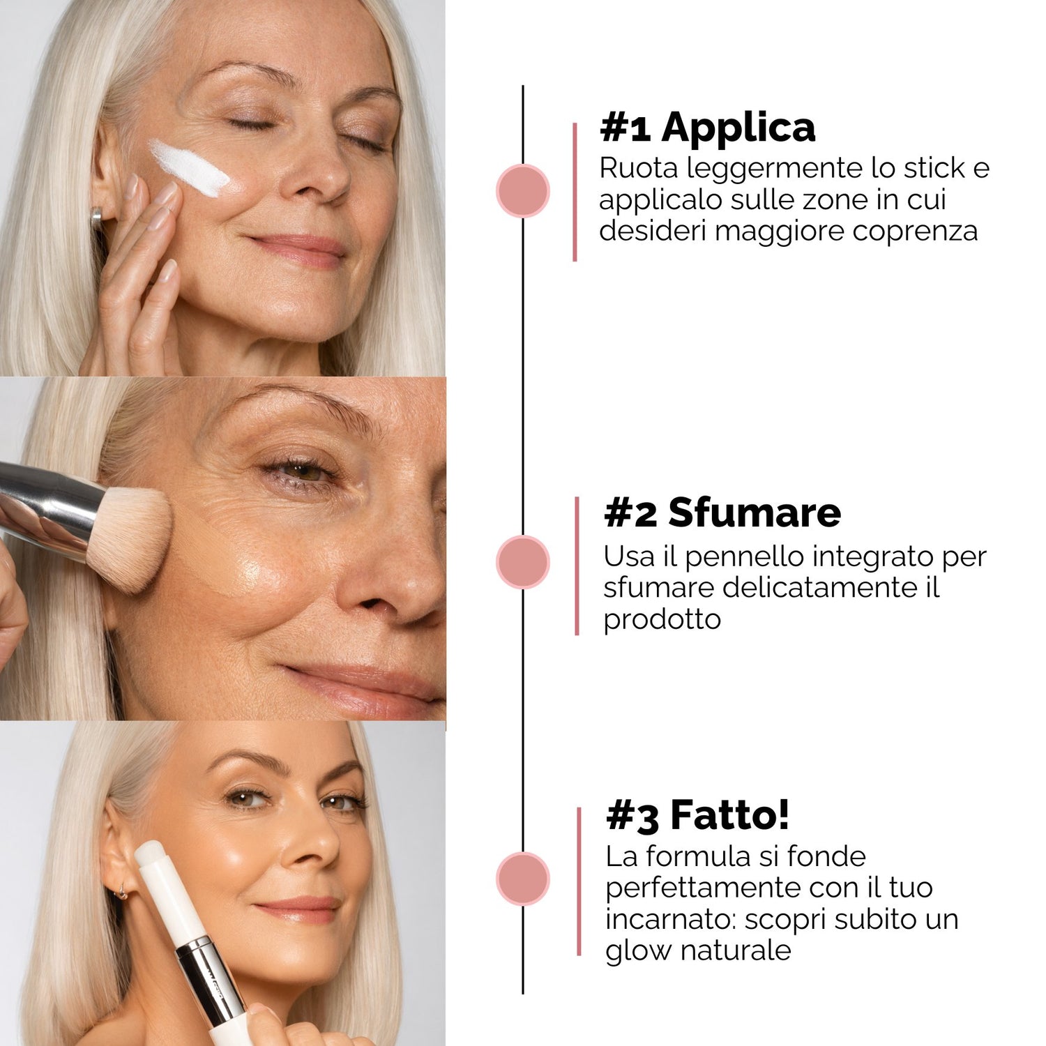 Per maggiore coprenza o un rapido ritocco, applica una seconda passata sulle zone da correggere. Portalo sempre con te: la pelle resta luminosa e visibilmente più giovane tutto il giorno.